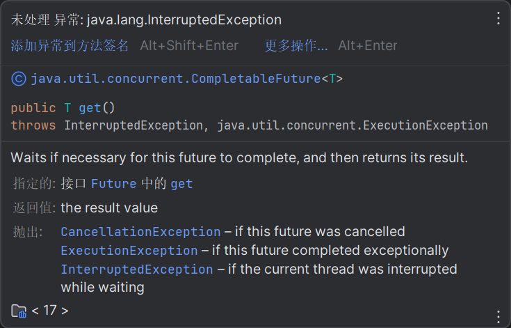 String result = orderFuture.join(); // 获取任务结果,发生异常时抛出 CompletionException
